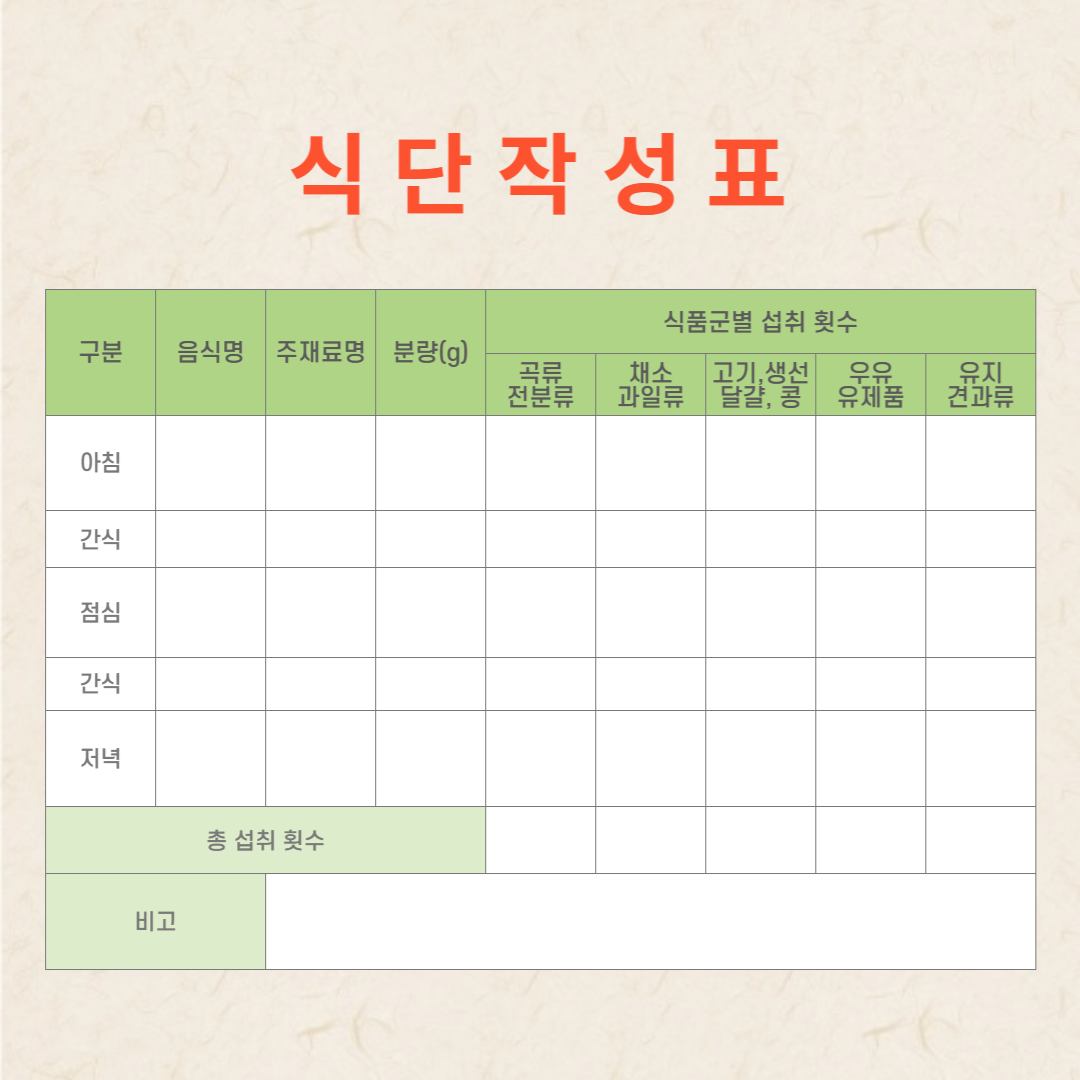 짜놓은 당뇨 식단에 따라 올바른 식단관리가 이루어질 수 있도록 하루에 섭취한 량을 기록하는 습관을 들여보세요.